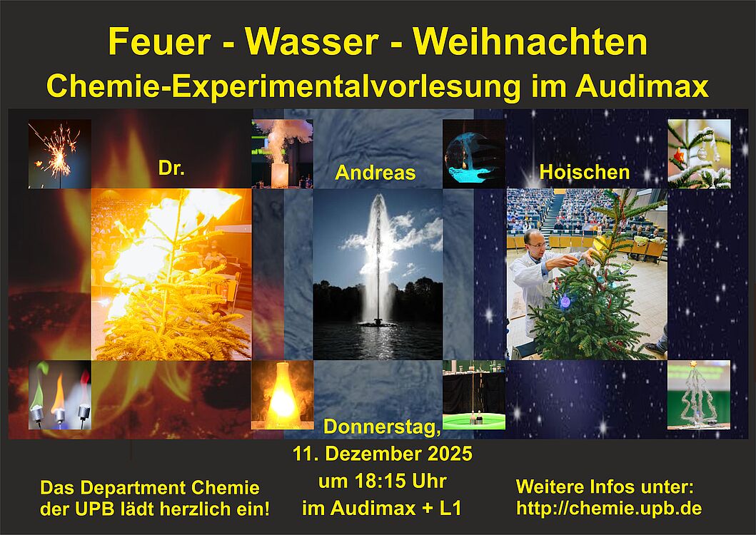 Feuer und Wasser stehen als Sinnbild für Gegensätze. Insbesondere zur Weihnachtszeit kann diese Tatsache aber sehr nützlich sein, nämlich, wenn der Baum brennt. Passiert das im größten Hörsaal an der Universität Paderborn, dann lädt Dr. Andreas Hoischen wieder zu seiner alljährlichen spektakulären Weihnachtsvorlesung ein.
