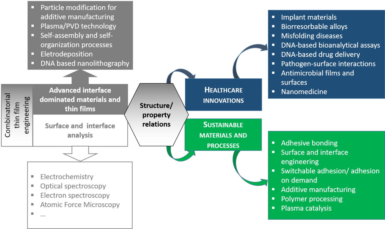 Der Lehrstuhl gliedert sich in die Forschungsbereiche "Materials Interfaces, Corrosion Science, and Sustainable Thin Film Engineering", "Advanced Surface and Interface Spectroscopy", "Polymer Interphases" und "Nanobiomaterials". In diesen Bereichen werden Fragestellungen zu den folgenden Themen bearbeitet: