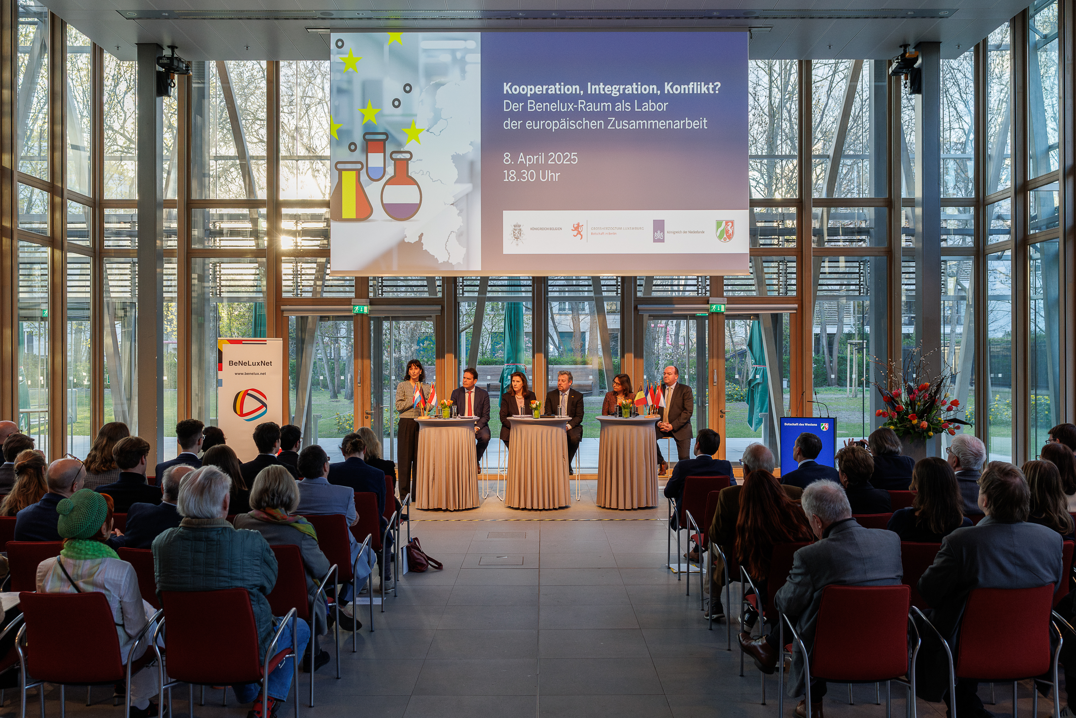 Der Launch der Plattform bot den Anlass für eine feierliche Abendveranstaltung in der Vertretung des Landes Nordrhein-Westfalen beim Bund in Berlin. Dort waren neben Prof. Dr. Sabine Schmitz, Dr. Resul Karaca und Dr. Saskia Vandenbussche, den Verantwortlichen des „BeneluxNet“, die Botschafter*innen bzw. Gesandte der Benelux-Länder und Benelux-Union sowie der CEO des Duisburger Hafens Markus Bangen zu einer Diskussionsrunde eingeladen. Diese wurde mit einem Video eingeleitet, in dem Studierende des Masterstudiengangs BeNeLux-Studien und des „BeneluxNet“-Teams spannende Fragen gestellt haben, die von den Panelteilnehmer*innen beantwortet wurden. Der Abend machte die sehr engen Verflechtungen zwischen Nordrhein-Westfalen und den Benelux-Staaten deutlich, die diese Region laut Bangen zu einem zentralen „Powerhouse Europas“ machen.