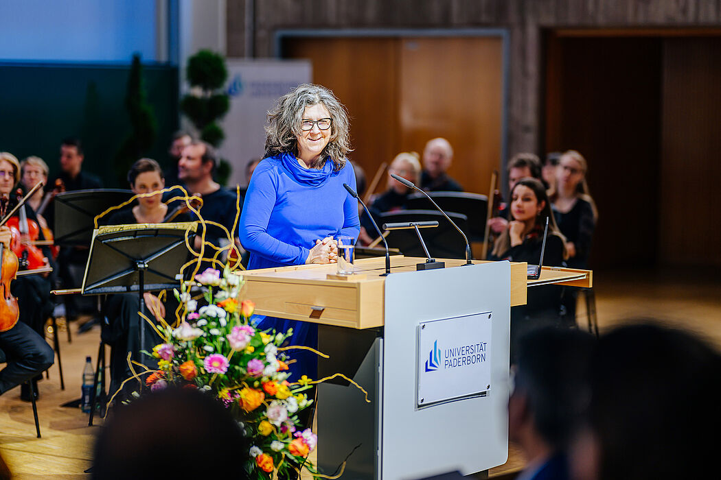 Mit dem Hochschulorchester, Preisverleihungen und rund 400 Gästen aus Wissenschaft, Wirtschaft und Politik hat die Universität Paderborn am Sonntag, 21. Januar, den traditionellen Neujahrsempfang gefeiert. Prof. Dr. Birgitt Riegraf blickte im Auditorium maximum auf das vergangene Jahr zurück und nutzte den Anlass, um ihre Amtszeit als Universitätspräsidentin Revue passieren zu lassen: „Gemeinsam haben wir Vieles angestoßen und Vieles erreicht. Wir haben die Universität Paderborn in Forschung und Lehre gestärkt, regional vernetzter und sichtbarer gemacht und die notwendigen Weichen gestellt, damit diese Entwicklungen in Zukunft anhalten. Unsere Universität steht heute in vielerlei Hinsicht so gut da wie vielleicht noch nie zuvor. Ich kann Sie nur herzlich dazu ermuntern, diese Erfolgsgeschichte auch in Zukunft gemeinschaftlich weiterzuschreiben.“
