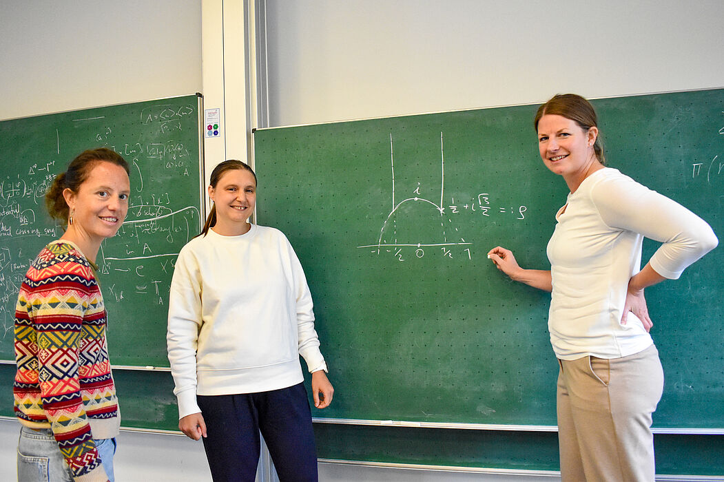Foto (Universität Paderborn, Nadija Carter): (v. l.) Die Mathematik-Professorinnen Ana Botero (Universität Bielefeld), Maryna Viazovska (Universität Lausanne) und Claudia Alfes (Universität Bielefeld) tauschen sich an der Universität Paderborn über neuste Erkenntnisse der mathematischen Grundlagenforschung aus. Viazovska hat als zweite Frau in der Geschichte eine Fields-Medaille erhalten.