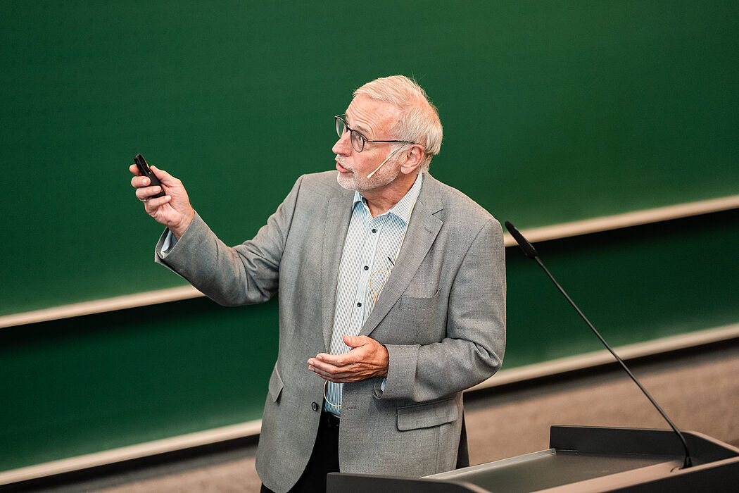 In seinem historischen Vortrag schlug Prof. Dr. Volker Peckhaus, emeritierter Professor für Wissenschaftstheorie und Philosophie der Technik an der Universität Paderborn, eine Brücke zwischen der Philosophie und der Mathematik. Dabei ging er u. a. auf zwei sogenannte „foundational crises in der griechischen und modernen Mathematik sowie einige Paradoxien ein, durch die beide wissenschaftliche Disziplinen miteinander verbunden sind.