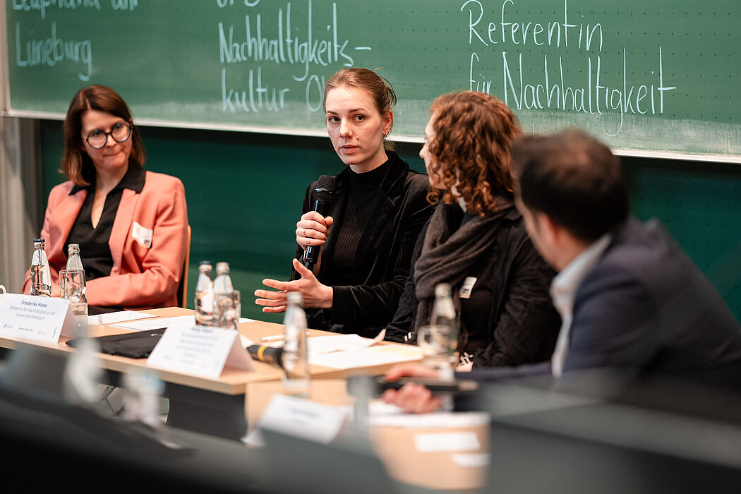 Nachhaltige Lehre an Hochschulen lässt sich aus unterschiedlichen Perspektiven betrachten. Bei einer Podiumsdiskussion, die von Daniel Al-Kabbani von Creaversity moderiert wurde, diskutierten Prof. Michelsen, Prof. Flath, Friederike Haver, Referentin für Nachhaltigkeit an der Universität Paderborn, und Svenja Volpers, Referentin für bildende Kultur und Nachhaltigkeit des Allgemeinen Studierendenausschusses (AStA), sowohl über grundsätzliche Fragen aus dem Bereich Nachhaltigkeit als auch deren Umsetzung an der Universität Paderborn. „Es wäre ein großer Fehler, das Thema Nachhaltigkeit zu verordnen. Sinnvoller ist es, für das Thema zu begeistern und es organisch wachsen zu lassen“, erklärte Prof. Flath. An der Universität gebe es dabei eine hohe intrinsische Motivation für nachhaltige Themen. „Der Wunsch vonseiten der Lehrenden nach Einbindung von Nachhaltigkeit in die Lehre ist enorm hoch“, fügte Haver hinzu. Im Anschluss an die Diskussionsrunde förderten interdisziplinäre „Round Tables“, Workshops, eine Postersession sowie ein hochschuldidaktischer „DisQspace“ den Hochschuldidaktischen Austausch.