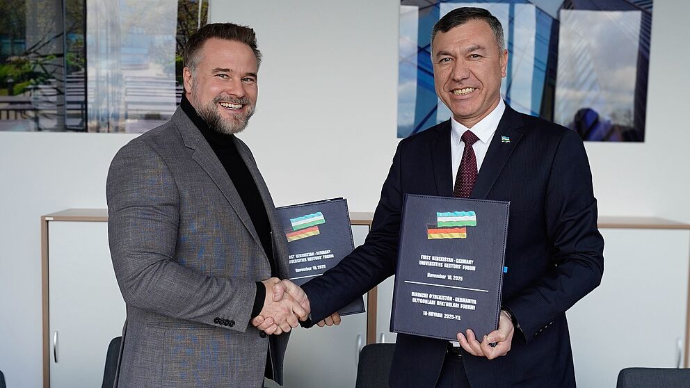 Am Donnerstag, 20. November, hat Prof. Dr. Ilkhomjon Tukhtasinov, Rektor der Usbekischen Staatlichen Weltsprachenuniversität, die Universität Paderborn besucht und mit Universitätspräsident Prof. Dr. Matthias Bauer ein „Memorandum of Understanding“ unterzeichnet.