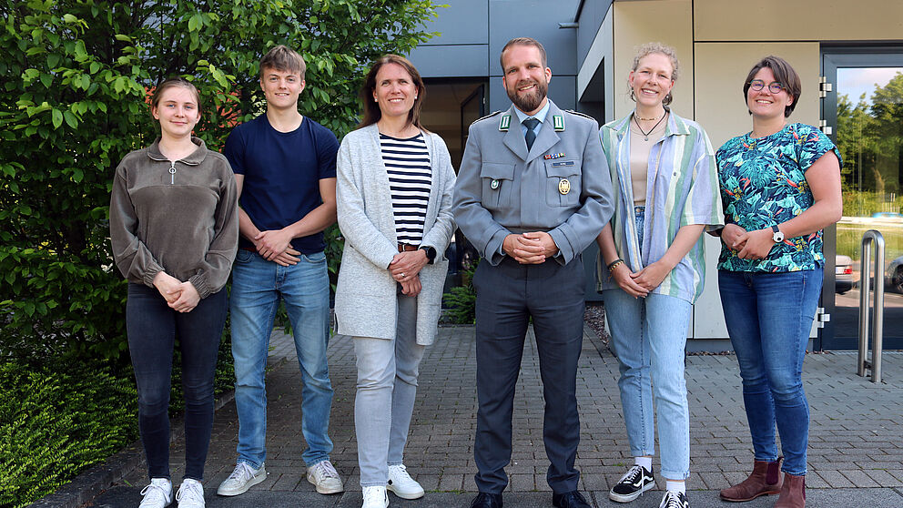 Foto (Heiko Appelbaum): Prof. Dr. Sabine Radtke (3. v. l.) und die Mitglieder ihrer Arbeitsgruppe (von links: Alina Vogel, Niklas Schlangenotto, Lotte Kütemeier und Pia Freier) begrüßten in Paderborn den Projektoffizier für die diesjährigen Invictus Games, Maximilian Kunz (3. v. r.).