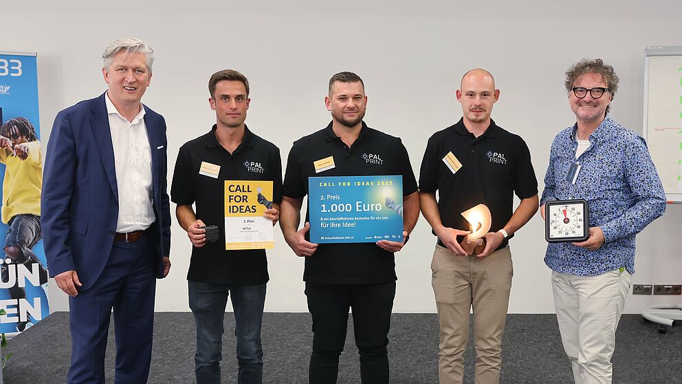 Foto (Dietmar Flach): Ansgar Käter, Vorstandsvorsitzender der VerbundVolksbank OWL (links), und Prof. Dr. Rüdiger Kabst, wissenschaftlicher Leiter des Technologietransfer- und Existenzgründungs-Center der Universität Paderborn (rechts), mit den Preisträgern des zweiten Platzes vom vergangenen Jahr Sebastian Frücht, Paul Johann Linder und Andreas Ribul-Olzer von „Palprint“. Das Team wird bei der diesjährigen Veranstaltung von ihren Erfahrungen und Fortschritten seit dem vergangenen Jahr berichten.